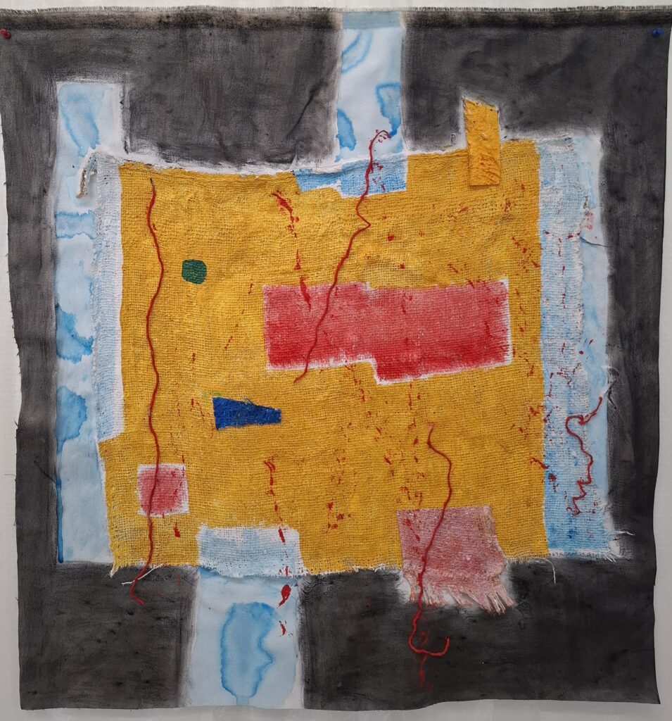 Dit werk toont een krachtige dialoog tussen textuur, kleur en lijn. Een groot geel vlak van grove jute domineert het midden en wordt onderbroken door rechthoekige vlakken in rood, een diepblauwe driehoek en een klein groen accent. De achtergrond wisselt tussen zachte blauw-witte vegen en donkere grijszwarte zones, waardoor een gelaagd spanningsveld ontstaat.