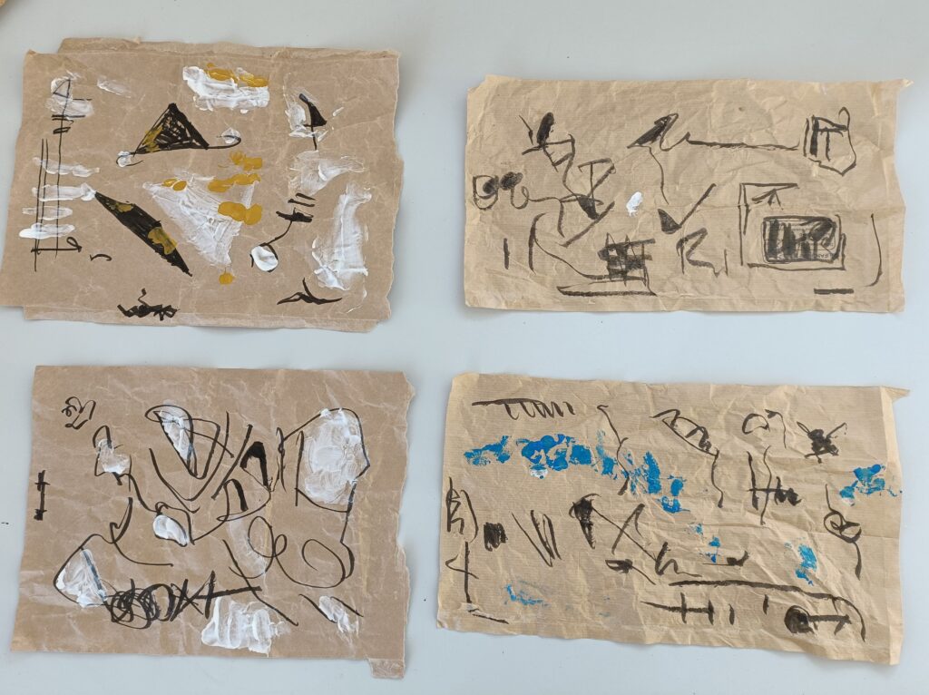 De afbeelding toont vier abstracte kunstwerken op bruine, gekreukelde papierstroken. Elk stuk bevat expressieve zwarte lijnen, met accenten van witte, goudgele en blauwe verf. De stijl doet denken aan spontane, schetsmatige tekeningen met een abstracte en experimentele benadering.